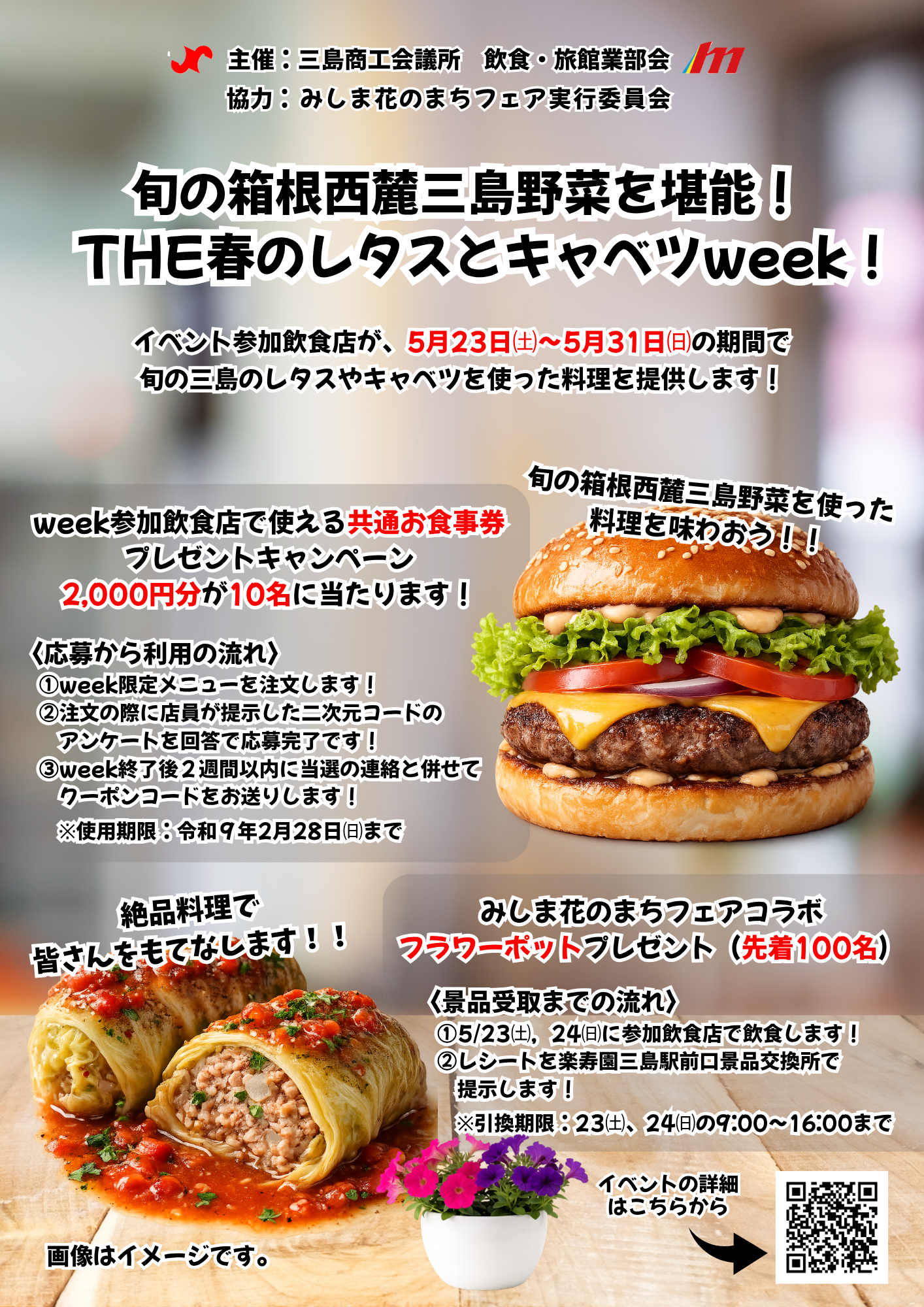 イベント参加飲食店が、5月23日㈯~5月31日㈰の期間で旬の三島のレタスやキャベツを使った料理を提供します!